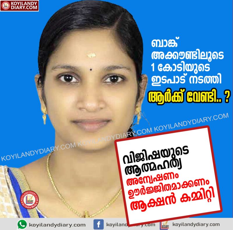 നാട്ടിലൊക്കെ ഏറെ ഉര്‍ജസ്വലയായ കുട്ടിയെന്ന നിലയില്‍ വലിയ ബഹുമാനമായിരുന്നു നാട്ടുകാര്‍ക്ക്. ഇടയ്ക്ക് താല്‍ക്കാലിക അടിസ്ഥാനത്തില്‍ പഠിച്ച സ്‌കൂളില്‍ തന്നെ ക്ലാസെടുക്കാനും പോയിരുന്നു. ഡിസംബര്‍ 12ന് പതിവ് പോലെ ജോലിക്ക് പോയ വിജിഷ തിരിച്ച് വന്നാണ് കൊയിലാണ്ടിയിലെ വീട്ടില്‍ തൂങ്ങി മരിച്ചത്. യു.പി.ഐ ആപ്പുകള്‍ വഴി പണമിടപാട് നടത്തിയതിന്റെ തെളിവുകളെല്ലാം നശിപ്പിക്കാനുള്ള ശ്രമവും ബിജിഷ നടത്തിയിരുന്നുവെന്നാണ് പോലീസ് ചൂണ്ടിക്കാട്ടുന്നത്. തുടര്‍ന്ന് ദുരൂഹത തോന്നിയ പോലീസ് ബാങ്കിലെത്തിയാണ് പണമിടപാടിന്റെ വിവരങ്ങള്‍ ശേഖരിച്ചത്. മരിച്ച ദിവസം രാവിലെ പോലും വളരെ  സന്തോഷവധിയായി നാട്ടുകാരോടും സുഹൃത്തുക്കളോടും ഇടപെട്ട വിജിഷയെ പലരും ഓര്‍ക്കുന്നുമുണ്ട്. ബിജിഷയുടെ  മരണത്തിന്റെ സത്യാവസ്ഥ എത്രയും പെട്ടെന്ന് പുറത്ത് കൊണ്ടുവരണമെന്ന് വീട്ടുകാരും ആവശ്യപ്പെടുന്നു.