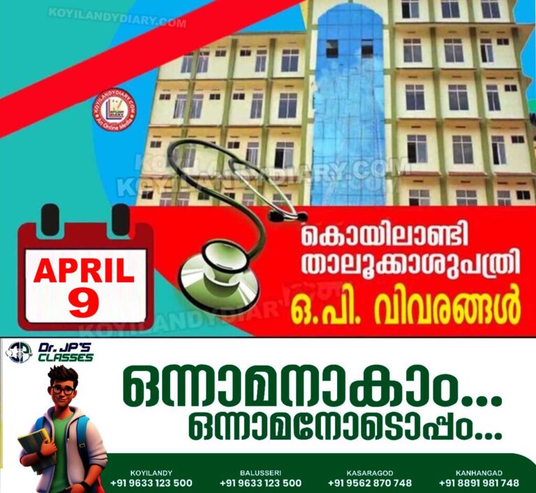 കൊയിലാണ്ടി താലൂക്കാശുപത്രിയിൽ ഏപ്രില് 09 ചൊവ്വാഴ്ചത്തെ ഒ.പി.യിൽ ലഭിക്കുന്ന സേവനങ്ങളെക്കുറിച്ചുള്ള വിവരങ്ങൾ. സി.ടി. സ്കാൻ പ്രവർത്തനസജ്ജം. താലൂക്കാശുപത്രിയിൽ ഇ-ഹെൽത്ത് പദ്ധതിയുടെ ഭാഗമായി ഇനി മുതൽ OP ടിക്കറ്റ് എടുക്കാൻ...