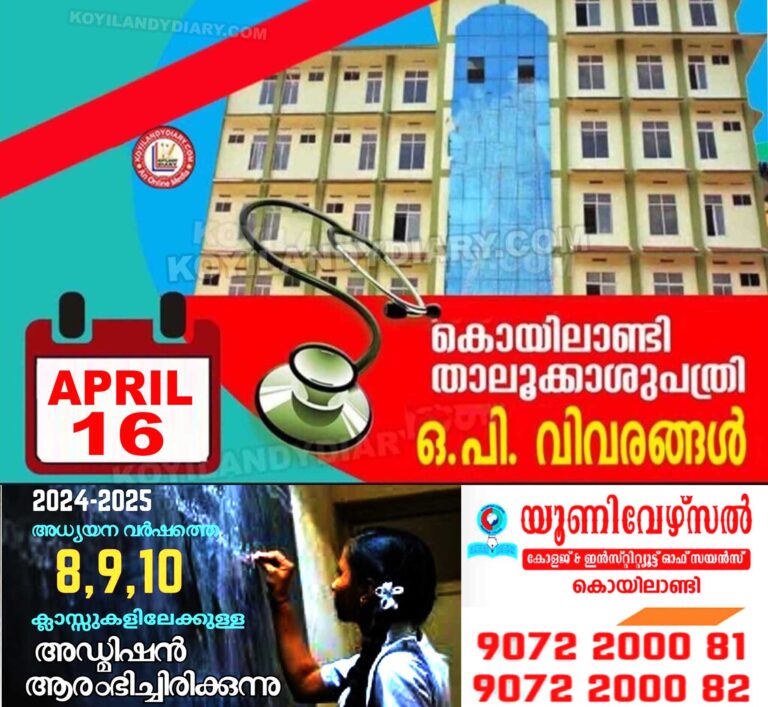 കൊയിലാണ്ടി താലൂക്കാശുപത്രിയിൽ ഏപ്രില് 16 ചൊവ്വാഴ്ചത്തെ ഒ.പി.യിൽ ലഭിക്കുന്ന സേവനങ്ങളെക്കുറിച്ചുള്ള വിവരങ്ങൾ. സി.ടി. സ്കാൻ പ്രവർത്തനസജ്ജം. താലൂക്കാശുപത്രിയിൽ ഇ-ഹെൽത്ത് പദ്ധതിയുടെ ഭാഗമായി ഇനി മുതൽ OP ടിക്കറ്റ് എടുക്കാൻ വരുന്നവർ...