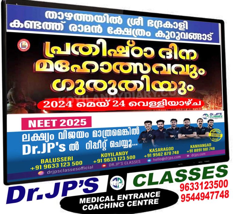 കൊയിലാണ്ടി: കുറുവങ്ങാട് താഴത്തയിൽ ശ്രീ ഭദ്രകാളി കണ്ടത്ത് രാമൻ ക്ഷേത്രത്തിലെ ഈ വർഷത്തെ പ്രതിഷ്ഠാദിന മഹോത്സവം മെയ് 24 വെള്ളിയാഴ്ച നടത്തുകയാണ്. ക്ഷേത്രം തന്ത്രി ശ്രീ സുബ്രമണ്യൻ...