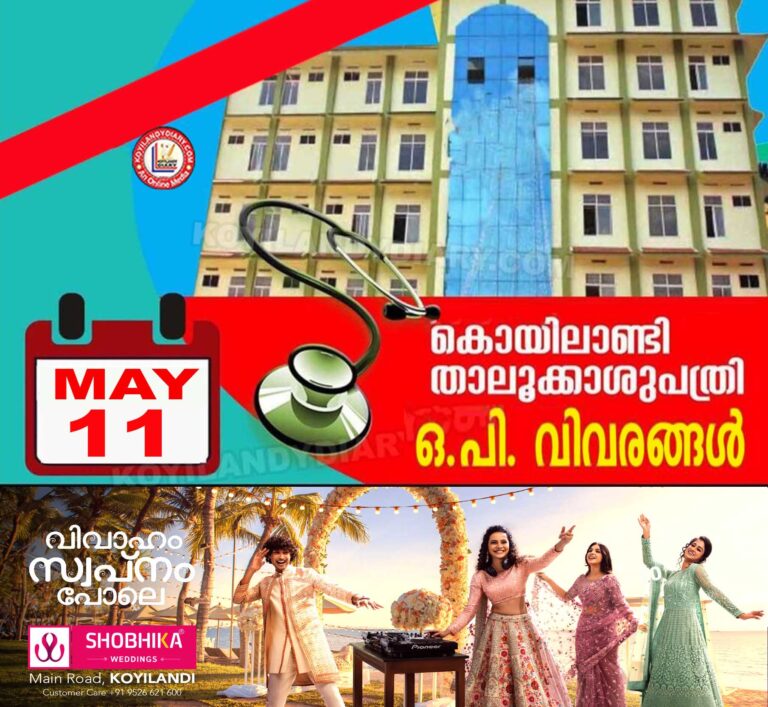 കൊയിലാണ്ടി താലൂക്കാശുപത്രിയിൽ മെയ് 11 ശനിയാഴ്ചത്തെ ഒ.പി.യിൽ ലഭിക്കുന്ന സേവനങ്ങളെക്കുറിച്ചുള്ള വിവരങ്ങൾ. സി.ടി. സ്കാൻ പ്രവർത്തനസജ്ജം. താലൂക്കാശുപത്രിയിൽ ഇ-ഹെൽത്ത് പദ്ധതിയുടെ ഭാഗമായി ഇനി മുതൽ OP ടിക്കറ്റ് എടുക്കാൻ വരുന്നവർ...