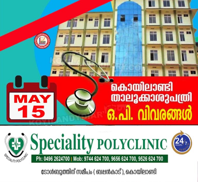 കൊയിലാണ്ടി താലൂക്കാശുപത്രിയിൽ മെയ് 15 ബുധനാഴ്ചത്തെ ഒ.പി.യിൽ ലഭിക്കുന്ന സേവനങ്ങളെക്കുറിച്ചുള്ള വിവരങ്ങൾ. സി.ടി. സ്കാൻ പ്രവർത്തനസജ്ജം. താലൂക്കാശുപത്രിയിൽ ഇ-ഹെൽത്ത് പദ്ധതിയുടെ ഭാഗമായി ഇനി മുതൽ OP ടിക്കറ്റ് എടുക്കാൻ വരുന്നവർ...
