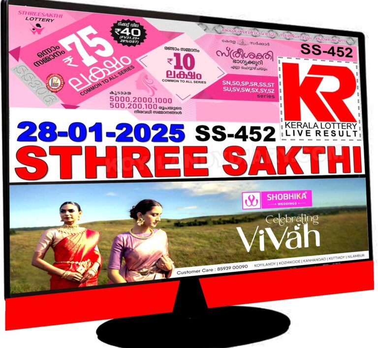 സ്ത്രീ ശക്തി SS 452 ലോട്ടറി ഇന്ന് മൂന്ന് മണിയ്ക്ക് നറുക്കെടുക്കും. 75 ലക്ഷമാണ് ഒന്നാം സമ്മാനമായി ലഭിക്കുക. 10 ലക്ഷം രൂപയാണ് രണ്ടാം സമ്മാനം. ഭാഗ്യക്കുറി...