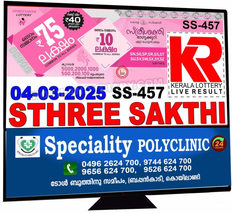 സ്ത്രീ ശക്തി SS 457 ലോട്ടറി ഇന്ന് മൂന്ന് മണിക്ക് നറുക്കെടുക്കും. ഭാഗ്യശാലിക്ക് 75 ലക്ഷമാണ് ഒന്നാം സമ്മാനമായി ലഭിക്കുക. 10 ലക്ഷം രൂപയാണ് രണ്ടാം സമ്മാനം....