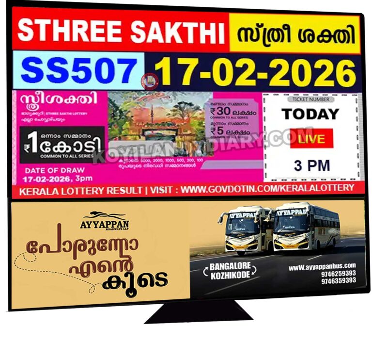 . സ്ത്രീ ശക്തി SS 507 ലോട്ടറി നറുക്കെടുപ്പ് ഇന്ന്. ഉച്ചയ്ക്ക് മൂന്ന് മണിക്കാണ് നറുക്കെടുപ്പ് നടക്കുക. ഭാഗ്യശാലിക്ക് ഒരു കോടി രൂപയാണ് ഒന്നാം സമ്മാനമായി ലഭിക്കുക....