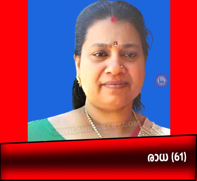 . കൊയിലാണ്ടി: കൊല്ലം ചന്ദ്രവിഹാറിൽ രാധ (61) നിര്യാതയായി. ഭർത്താവ്: ചന്ദ്രൻ. മക്കൾ: ജിജു (ബയോ മെഡിക്കൽ കൊയിലാണ്ടി), ബൈജു (ബഹ്റയിൻ). മരുമക്കൾ: സാൻസി ജിജു, അനുഷ...