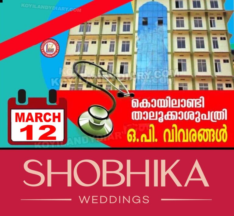 കൊയിലാണ്ടി താലൂക്ക് ആശുപത്രിയിൽ മാര്ച്ച് 12 വ്യാഴാഴ്ചത്തെ ഒ.പി.യിൽ ലഭിക്കുന്ന സേവനങ്ങളെക്കുറിച്ചുള്ള വിവരങ്ങൾ.. താലൂക്കാശുപത്രിയിൽ ഇ-ഹെൽത്ത് പദ്ധതിയുടെ ഭാഗമായി ഇനി മുതൽ OP ടിക്കറ്റ് എടുക്കാൻ വരുന്നവർ ആധാർ കാർഡ്,...