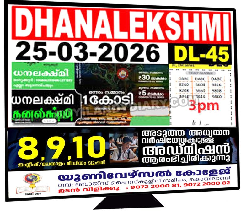 . ധനലക്ഷ്മി DL 45 ലോട്ടറി നറുക്കെടുപ്പ് ഇന്ന്. ഒരു കോടി രൂപയാണ് ലോട്ടറിയുടെ ഒന്നാം സമ്മാനം. ഇതു കൂടാതെ രണ്ടാം സമ്മാനമായി 30 ലക്ഷവും മൂന്നാം...