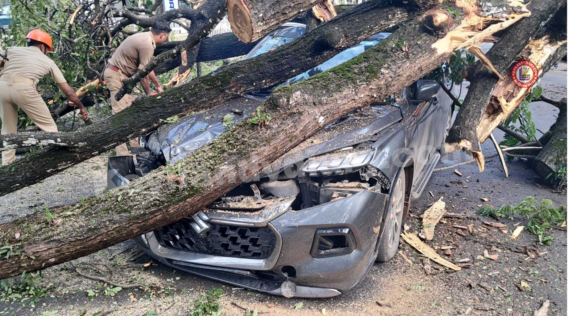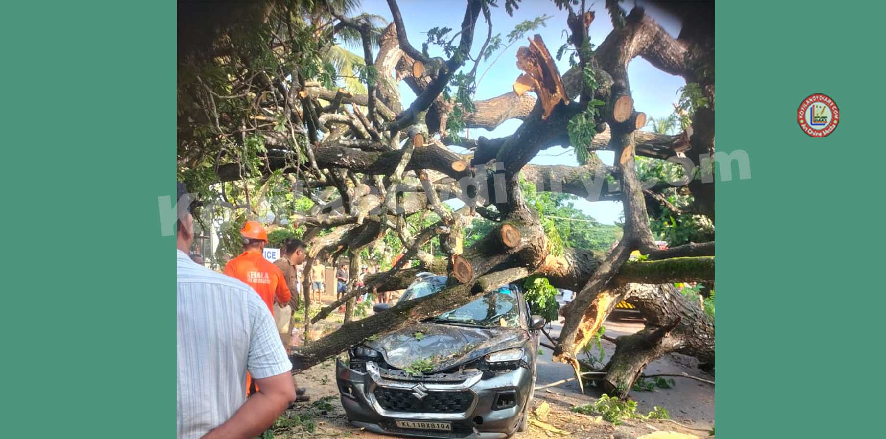 മരത്തിനടിയിൽപ്പെട്ട കാറിലെ യാത്രകാരനെ നാട്ടുകാരാണ് യാതൊരു പരിക്കുമില്ലാതെ പുറത്തെടുത്തത്. പരിക്കേറ്റ സ്കൂട്ടർ യാത്രകാരനെ താലുക്ക് ആശുപത്രിയിൽ പ്രവേശിപ്പിച്ചു. ദേശീയ പാതയിലെ ഗതാഗതം ബൈപ്പാസിലൂടെ തിരിച്ചു വിട്ടു. അഗ്നി രക്ഷാ സേന മരം മുറിച്ചു മാറ്റുകയാണ്. പോലീസും സ്ഥലത്തുണ്ട്.