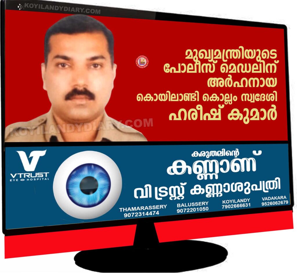 തിരുവനന്തപുരം: വിശിഷ്ട സേവനത്തിനുള്ള കേരള മുഖ്യമന്ത്രിയുടെ പോലീസ് മെഡൽ നേടിയവരിൽ കൊയിലാണ്ടി കൊല്ലം സ്വദേശിയും. നടക്കാവ് പോലീസ് സ്റ്റേഷനിലെ സീനിയർ സിവിൽ പോലീസ് ഓഫീസർ ഹരീഷ് കുമാറാണ് മെഡലിന് അർഹനായത്. കൊല്ലം ചാത്തോത്ത് ഹരിദാസിന്റെയും സതീദേവിയുടെയും മകനാണ്. ഭാര്യ അർച്ചന തലശ്ശേരി വ്യവസായ വകുപ്പ് ജീവനക്കാരിയാണ്. ദേവമിത്ര, ചിദൻ ഹരി എന്നിവർ മക്കളാണ്.