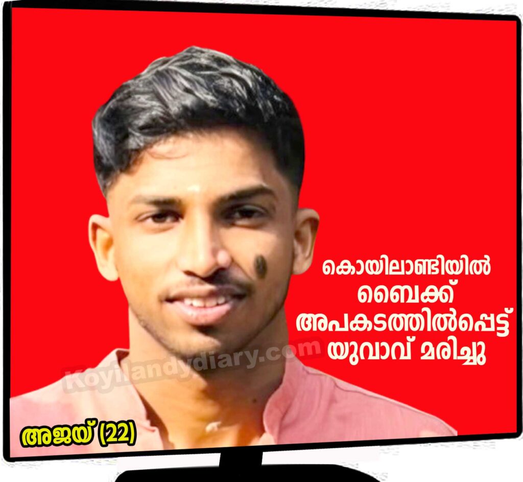 കൊയിലാണ്ടിയില് ബൈക്ക് നിയന്ത്രണംവിട്ട് ടെലിഫോണ് പോസ്റ്റിലിടിച്ചുണ്ടായ അപകടത്തില് യുവാവ് മരിച്ചു. സുഹൃത്തിന് പരിക്കേറ്റു. പന്തലായനി മണ്ണാത്ത് മീത്തല് സുനിലിന്റെ മകന് അജയ് (22) ആണ് മരിച്ചത്. (താമരശ്ശേരി ഇന്ഡസ് മോട്ടോര്സ് ഇലക്ട്രീഷ്യനാണ്). കൂടെ ഉണ്ടായിരുന്ന പന്തലായനി പൊന്നാരത്തില് ആദര്ശ് (23) നെ പരിക്കുകളോടെ മെഡിക്കല് കോളജില് പ്രവേശിപ്പിച്ചിട്ടുണ്ട്. കൊയിലാണ്ടി ബപ്പന്കാട് റോഡില് മത്സ്യമാര്ക്കറ്റിനടുത്ത് പുലര്ച്ചെ 2.30 ഓടെയാണ് അപകടം ഉണ്ടായത്. അജയ്-യുടെ മൃതദേഹം കോഴിക്കോട് മെഡിക്കല് കോളജ് മോര്ച്ചറിയിലേക്ക് മാറ്റി. പോസ്റ്റുമോര്ട്ടത്തിനുശേഷം ഉച്ചകഴിഞ്ഞ് 3 മണിക്ക് വീട്ടുവളപ്പില് സംസ്ക്കരിക്കും. അമ്മ: നിഷ, സഹോദരി: അര്ഷ.