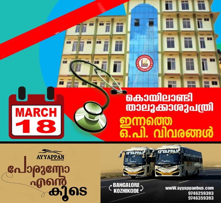 കൊയിലാണ്ടി താലൂക്ക് ആശുപത്രിയിൽ മാര്ച്ച് 18 ബുധനാഴ്ചത്തെ ഒ.പി.യിൽ ലഭിക്കുന്ന സേവനങ്ങൾ.. താലൂക്കാശുപത്രിയിൽ ഇ-ഹെൽത്ത് പദ്ധതിയുടെ ഭാഗമായി ഇനി മുതൽ OP ടിക്കറ്റ് എടുക്കാൻ വരുന്നവർ ആധാർ കാർഡ്, മൊബൈൽ...