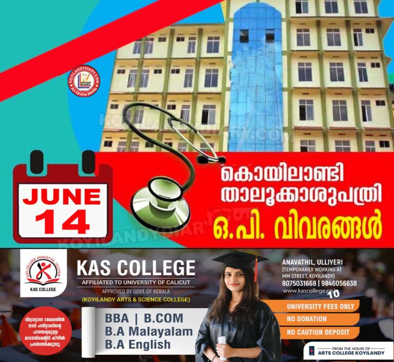 കൊയിലാണ്ടി താലൂക്കാശുപത്രിയിൽ ജൂൺ 14 വെള്ളിയാഴ്ചത്തെ ഒ.പി.യിൽ ലഭിക്കുന്ന സേവനങ്ങളെക്കുറിച്ചുള്ള വിവരങ്ങൾ. സി.ടി. സ്കാൻ പ്രവർത്തനസജ്ജം. താലൂക്കാശുപത്രിയിൽ ഇ-ഹെൽത്ത് പദ്ധതിയുടെ ഭാഗമായി ഇനി മുതൽ OP ടിക്കറ്റ് എടുക്കാൻ...