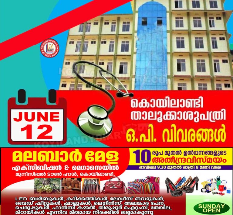 കൊയിലാണ്ടി താലൂക്കാശുപത്രിയിൽ ജൂൺ 12 ബുധനാഴ്ചത്തെ ഒ.പി.യിൽ ലഭിക്കുന്ന സേവനങ്ങളെക്കുറിച്ചുള്ള വിവരങ്ങൾ. സി.ടി. സ്കാൻ പ്രവർത്തനസജ്ജം. താലൂക്കാശുപത്രിയിൽ ഇ-ഹെൽത്ത് പദ്ധതിയുടെ ഭാഗമായി ഇനി മുതൽ OP ടിക്കറ്റ് എടുക്കാൻ വരുന്നവർ...