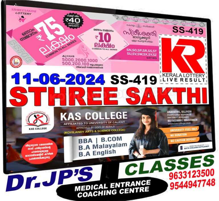 സ്ത്രീ ശക്തി SS-419 ലോട്ടറി ഇന്ന് മൂന്ന് മണിയ്ക്ക് നറുക്കെടുക്കും. 75 ലക്ഷമാണ് ഒന്നാം സമ്മാനമായി ലഭിക്കുക. 10 ലക്ഷം രൂപയാണ് രണ്ടാം സമ്മാനം. ഭാഗ്യക്കുറി വകുപ്പിന്റെ...