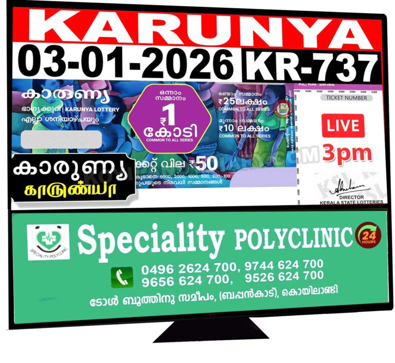 . കാരുണ്യ കെആർ- 737 ലോട്ടറി നറുക്കെടുപ്പ് ഇന്ന്. എല്ലാ ശനിയാഴ്ചകളിലും ഉച്ചയ്ക്ക് മൂന്ന് മണിക്കാണ് നറുക്കെടുപ്പ് നടക്കുക. ഒന്നാം സമ്മാനം ഒരു കോടി രൂപയാണ്. രണ്ടാം...