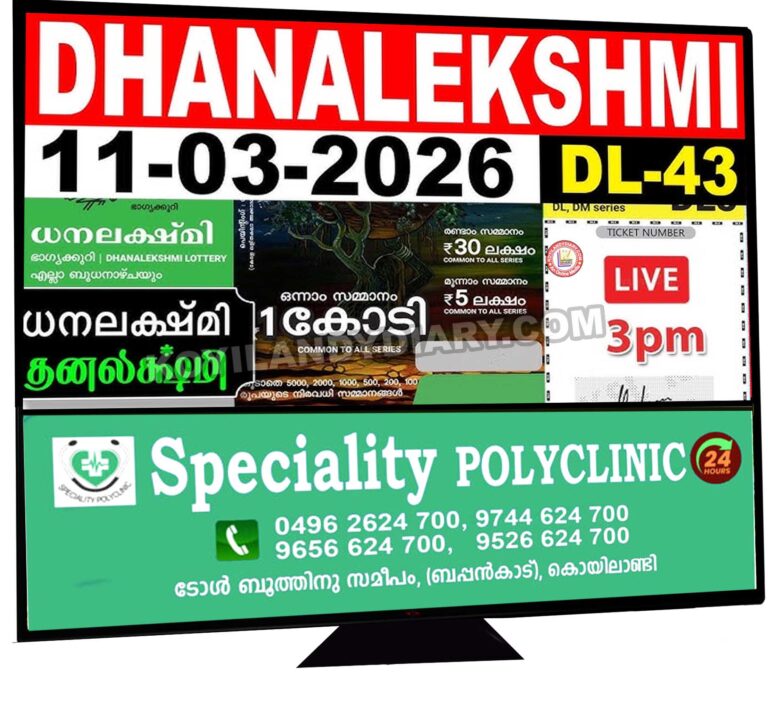 . ധനലക്ഷ്മി ലോട്ടറി DL 43 നറുക്കെടുപ്പ് ഇന്ന്. ഒരു കോടി രൂപയാണ് ലോട്ടറിയുടെ ഒന്നാം സമ്മാനം. ഇതു കൂടാതെ രണ്ടാം സമ്മാനമായി 30 ലക്ഷവും മൂന്നാം...