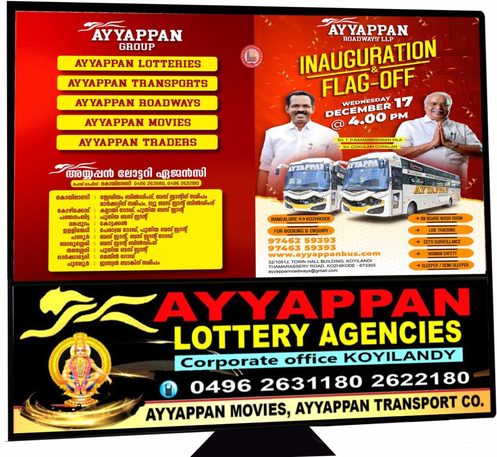 കൊയിലാണ്ടി: ട്രാവൽസ് മേഖലയിൽ ആത്മാർത്ഥതയും സമയകൃത്യതയുമായ സേവനം കാഴ്‌ചവെച്ച് യാത്രക്കാരുടെ പ്രശംസ പിടിച്ചുപറ്റിയ അയ്യപ്പൻ ട്രാൻസ്പോർട്ട്സ് ആധുനിക സൗകര്യങ്ങളോടുകൂടിയ ബാംഗ്ലൂർ-കോഴിക്കോട്, കോഴിക്കോട്-ബാംഗ്ലൂർ ബസ് സർവ്വീസ് കൊയിലാണ്ടി ടൗൺഹാൾ ബിൽഡിംങ്ങിൽ പ്രവർത്തനം ആരംഭിക്കുന്നു. ഉദ്ഘാടനവും പുതിയ ബസുകളുടെ ഫ്ലാഗ് ഓഫും ഡിസംബർ 17, ബുധനാഴ്‌ച വൈകിട്ട് 4.00 മണിക്ക് എംഎൽഎ ടി.പി രാമകൃഷ്ണൻ നിർവ്വഹിക്കും. മുൻ നഗരസഭ ചെയർപേഴ്സൺ കെ.പി സുധ അദ്ധ്യക്ഷതവഹിക്കും. ഗോകുലം ഗോപാലൻ ഓഫീസ് ഉദ്ഘാടനം നിർവ്വഹിക്കും.