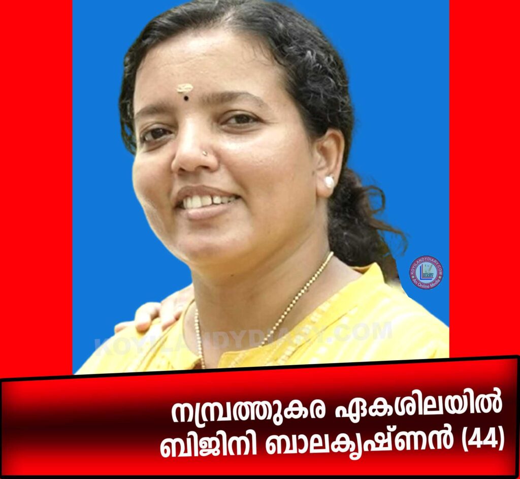 കൊയിലാണ്ടി: നമ്പ്രത്ത്കര ഏകശിലയിൽ പരേതനായ ബാലകൃഷ്ണൻ നായരുടേയും പ്രേമാവതിയുടേയും മകൾ ബിജിനി ബാലകൃഷ്ണൻ (44) നിര്യാതയായി. (ബറോഡയിൽ വെച്ചാണ് മരണപ്പെട്ടത്). ഭർത്താവ്: സുധീർ കുമാർ (ബറോഡ). മക്കൾ: സജ്ഞന എസ്. നായർ, സാക്ഷി എസ് നായർ. സഹോദരൻ: ബിജേഷ് ബാലകൃഷ്ണൻ. സംസ്കാരം: ശനിയാഴ്ച