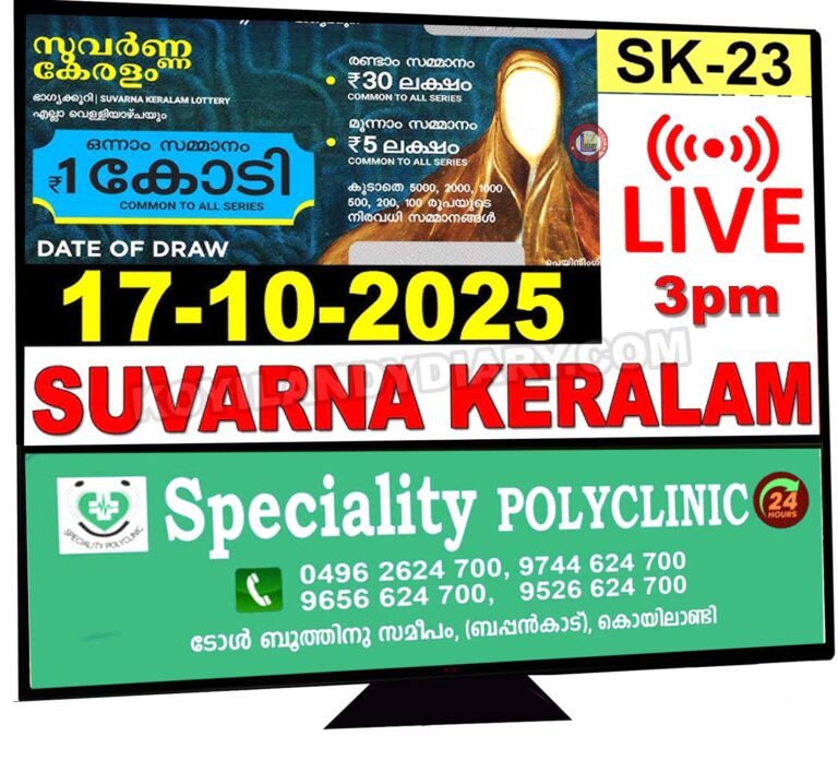 . സുവർണ കേരളം ലോട്ടറി SK 23 നറുക്കെടുപ്പ് ഇന്ന്. എല്ലാ വെള്ളിയാഴ്ചകളിലും ഉച്ചയ്ക്ക് 2 മണിക്കാണ് ലോട്ടറി ഫലം പ്രഖ്യാപിക്കുന്നത്. ഒന്നാം സമ്മാനം ഒരു കോടി...