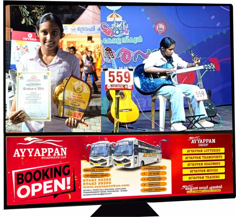 തൃശ്ശൂർ; 64-ാം സംസ്ഥാന സ്കൂൾ കലോത്സവത്തിൽ എച്ച്.എസ്.എസ് ഗിറ്റാർ (പാശ്ചാത്യം) വിഭാഗത്തിൽ തിരുവങ്ങൂർ ഹയർ സെക്കൻ്ററി സ്കൂൾ വിദ്യാർത്ഥി എ ഗ്രേഡ് നേടി. നീഹാര എൻ. തയ്യിൽ....