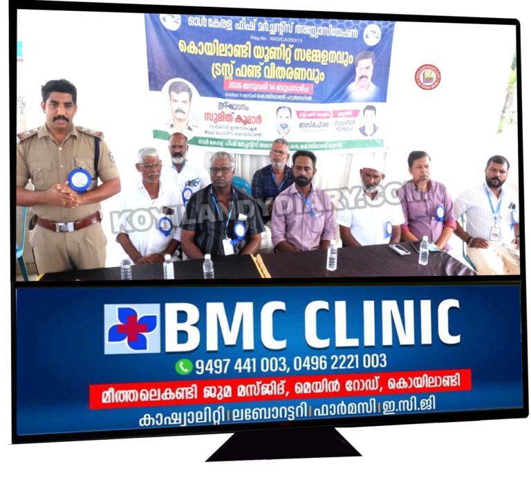 . കൊയിലാണ്ടി: ഓൾ കേരള ഫിഷ് മർച്ചന്റ് അസോസിയേഷൻ കൊയിലാണ്ടി യൂണിറ്റ് സമ്മേളനം കൊയിലാണ്ടി സബ് ഇൻസ്പെക്ടർ സുജീലേഷ് എം. ഉദ്ഘാടനം ചെയ്തു. മരണപ്പെട്ട മത്സ്യ വ്യാപാരി...