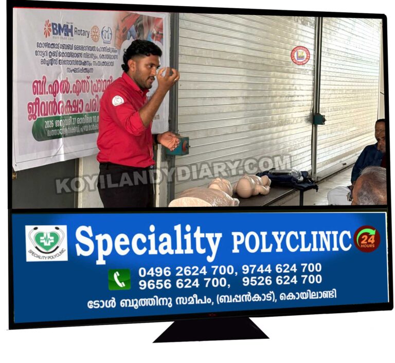 . കൊയിലാണ്ടി മർച്ചൻസ് അസോസിയേഷനും റോട്ടറി ക്ലബ് സ്മാർട്ടും സംയുക്തമായി കോഴിക്കോട് ബേബി മെമ്മോറിയൽ ഹോസ്പിറ്റൽ സഹകരണത്തോടെ കൊയിലാണ്ടിയിൽ ബിഎൽസ് ജീവൻ രക്ഷാ പ്രാഥമിക പരിശീലന ക്യാമ്പ്...