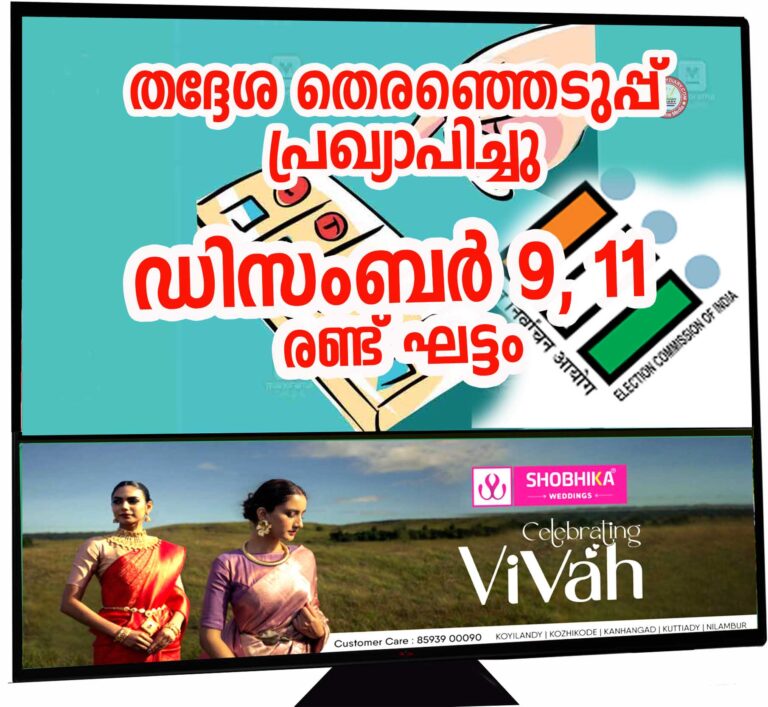 കേരളത്തിൽ തദ്ദേശ സ്വയംഭരണ സ്ഥാപനങ്ങളിലേക്കുള്ള തെരഞ്ഞെടുപ്പ് പ്രഖ്യാപിച്ചു. സിഡംബർ 9നും, 11നും രണ്ട് ഘട്ടങ്ങളിലായി നടക്കും. തിരുവനന്തപുരം, കൊല്ലം, പത്തനംതിട്ട, ആലപ്പുഴ, കോട്ടയം, ഇടുക്കി, എറണാകുളം എന്നീ...