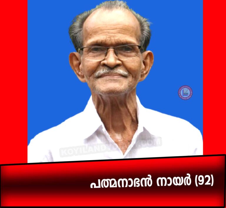 കൊയിലാണ്ടി: പന്തലായനി കിഴക്കെ വീട്ടില് പത്മനാഭന് നായർ (92) നിര്യാതനായി. ഭാര്യ: പരേതയായ കാർത്ത്യായനി അമ്മ. മക്കള്: ശാന്ത കുമാര്, ശശി കുമാര്, സുനില് കുമാര്. മരുമക്കൾ:...