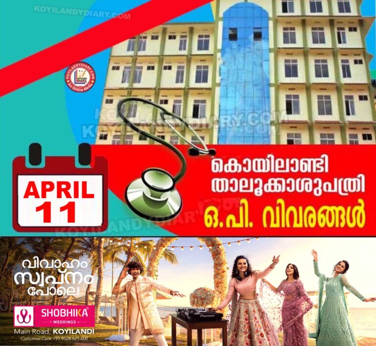 കൊയിലാണ്ടി താലൂക്കാശുപത്രിയിൽ ഏപ്രില് 11 വ്യാഴാഴ്ചത്തെ ഒ.പി.യിൽ ലഭിക്കുന്ന സേവനങ്ങളെക്കുറിച്ചുള്ള വിവരങ്ങൾ. സി.ടി. സ്കാൻ പ്രവർത്തനസജ്ജം. താലൂക്കാശുപത്രിയിൽ ഇ-ഹെൽത്ത് പദ്ധതിയുടെ ഭാഗമായി ഇനി മുതൽ OP ടിക്കറ്റ് എടുക്കാൻ...