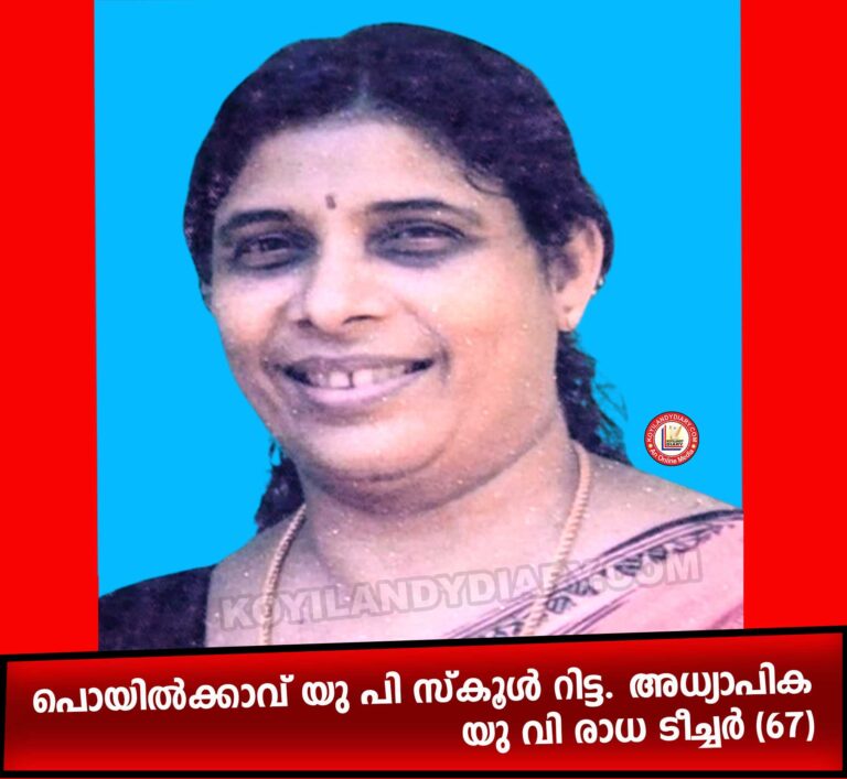 കൊയിലാണ്ടി: പൊയിൽക്കാവ് യു.പി.സ്കൂൾ റിട്ട. അധ്യാപിക യു.വി. രാധ ടീച്ചർ (67) നിര്യാതയായി. പരേതരായ തെക്കെടത്ത് നാരായണൻ നായർ ലക്ഷ്മി അമ്മ എന്നിവരുടെ മകളാണ്. ഭർത്താവ്: ദാമോദരൻ...