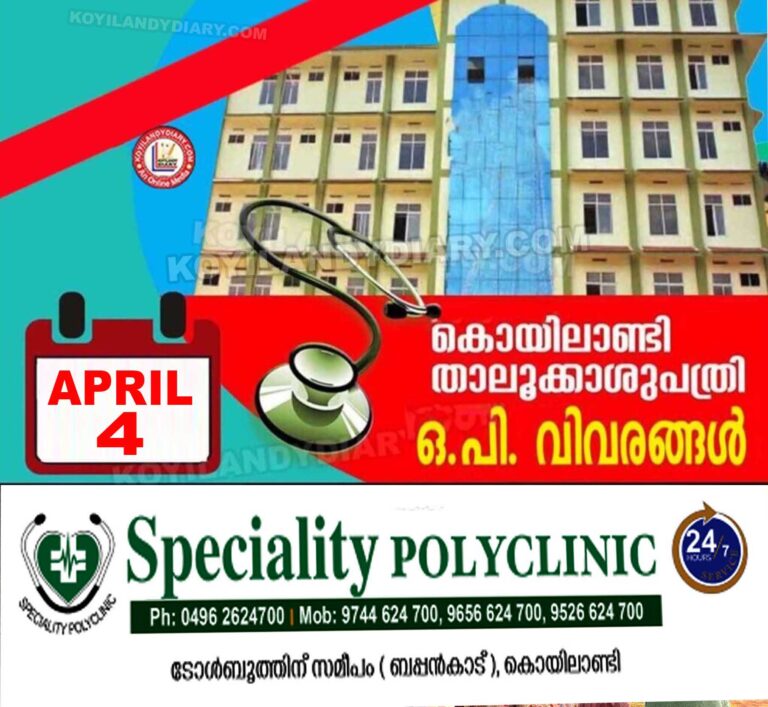 കൊയിലാണ്ടി സ്പെഷ്യാലിറ്റി പോളിക്ലിനിക്കിൽ ഏപ്രിൽ 04 വ്യാഴാഴ്ച പ്രവർത്തിക്കുന്ന ഒപികളും ഡോക്ടർമാരും സേവനങ്ങളും.. 1. ജനറൽ പ്രാക്ടീഷ്ണർ ഡോ : മുസ്തഫ മുഹമ്മദ്. 9 am to...