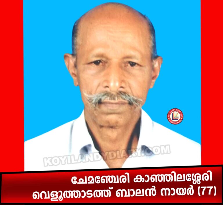 കൊയിലാണ്ടി: ചേമഞ്ചേരി കാഞ്ഞിലശ്ശേരി വെളുത്താടത്ത് ബാലൻ നായർ (77) നിര്യാതനായി. സി.പി.ഐ (എം) ഏരിയാ കമ്മിറ്റി അംഗം, ലോക്കൽ സെക്രട്ടറി, ഗ്രാമ പഞ്ചായത്തംഗം, കർഷക സംഘം ഏരിയാ...