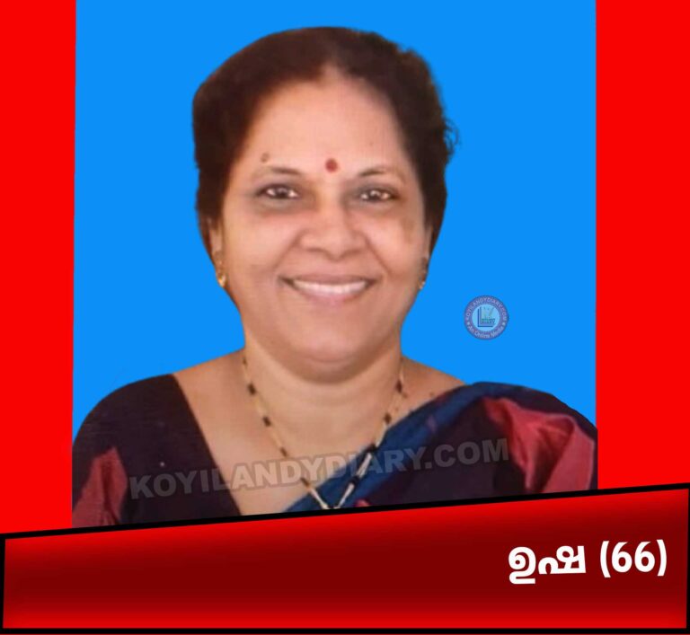 . കൊയിലാണ്ടി: പൂക്കാട് കിഴക്കേമഠത്തിൽ താമസിക്കുന്ന കെ. ടി. ബസാർ രയരോത്ത് ഉഷ (66) നിര്യാതയായി. ഭർത്താവ്: ചന്ദ്രശേഖരൻ. മക്കൾ: കിരൺ, അനുശ്രീ (IDBI Bank). മരുമക്കൾ:...