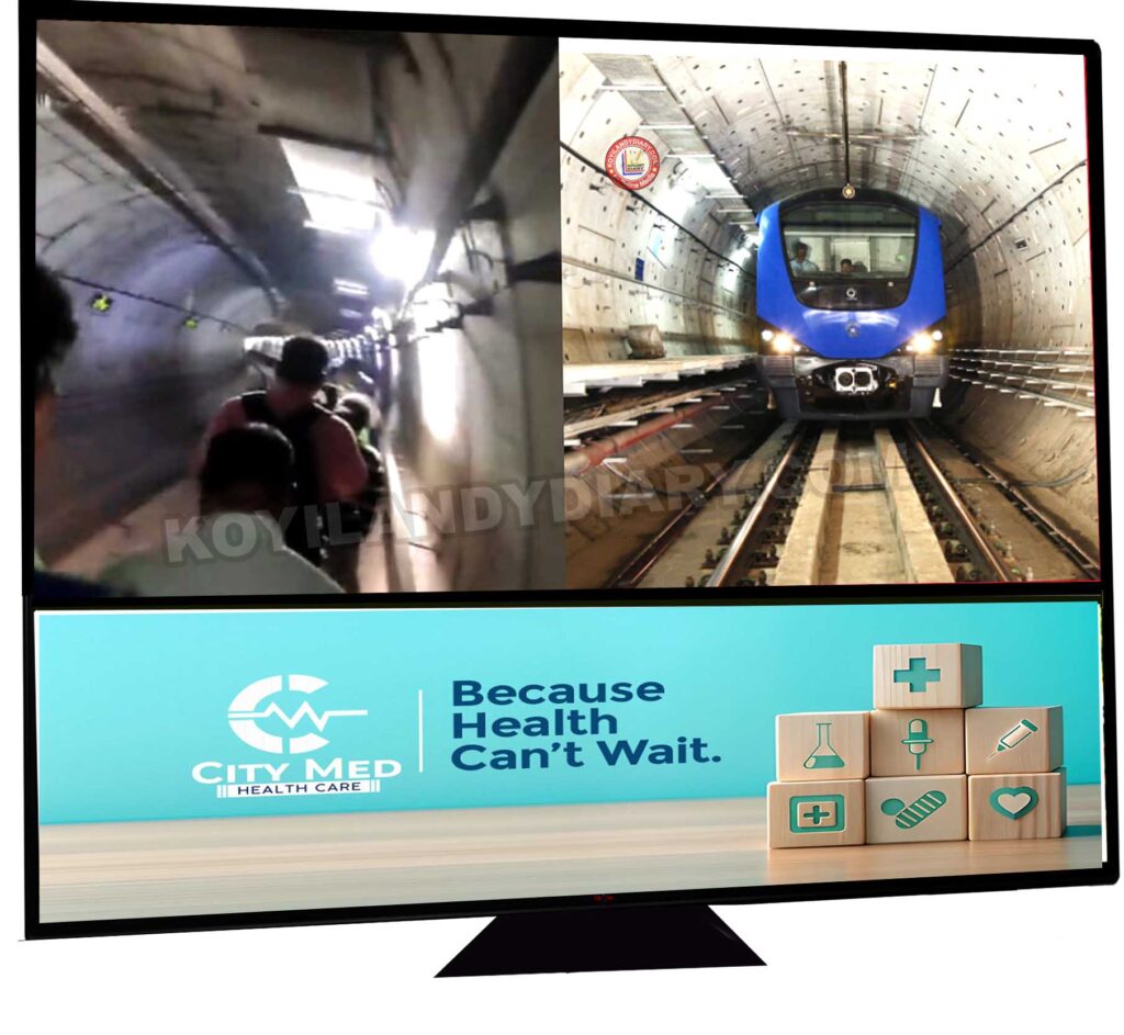 തുരങ്കുത്തിനുള്ളിൽ കുടുങ്ങി ചെന്നൈ മെട്രോ ട്രെയിൻ: ലൈറ്റും പോയി: തുരങ്കത്തിലൂടെ നടന്ന് പുറത്തെത്തി യാത്രക്കാർ
