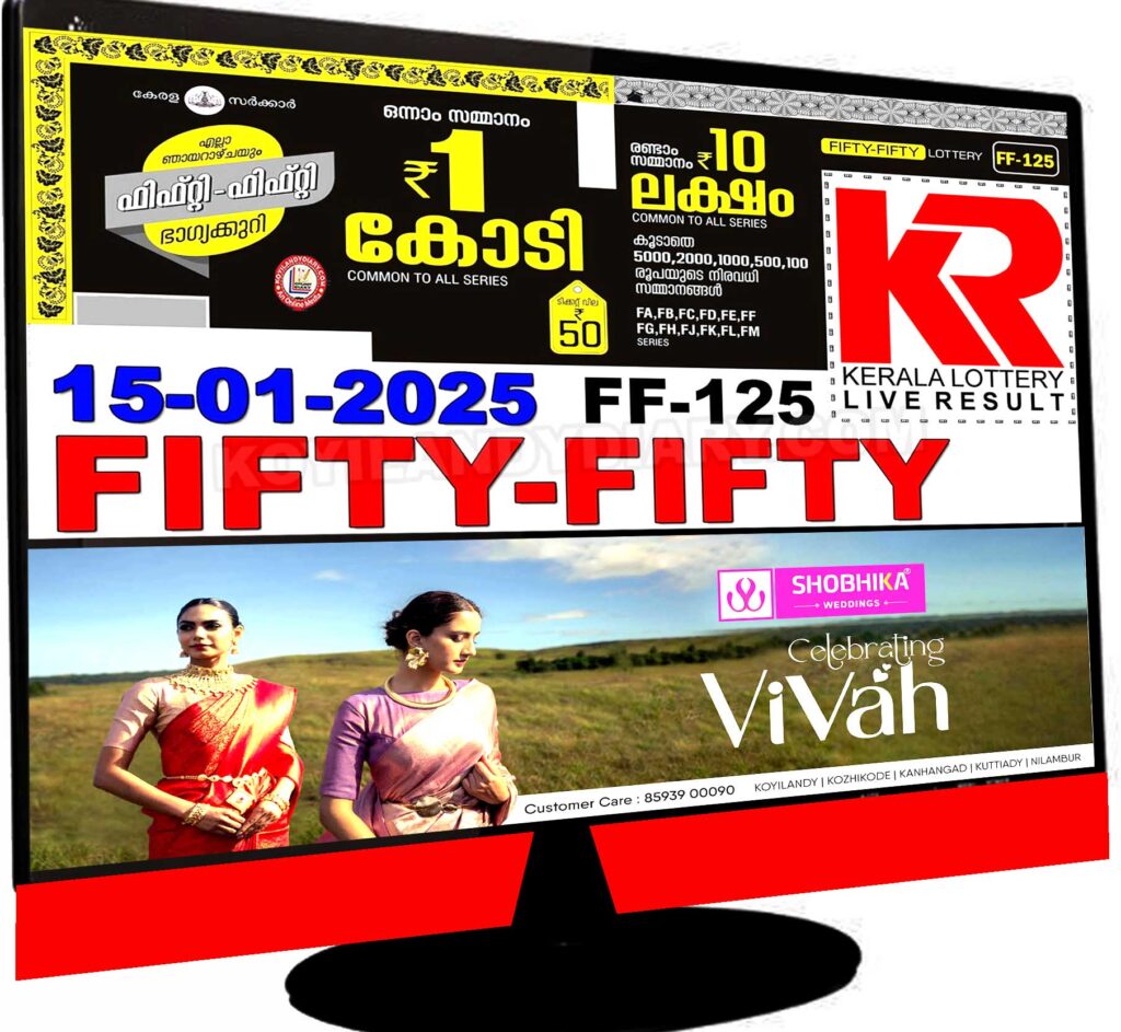 ഫിഫ്റ്റി- ഫിഫ്റ്റി FF 125 ലോട്ടറി ഇന്ന് മൂന്ന് മണിക്ക് നറുക്കെടുക്കും. ഒരു കോടി രൂപയാണ് ഫിഫ്റ്റി ഫിഫ്റ്റി ലോട്ടറി ഒന്നാം സമ്മാനമായി നൽകുന്നത്. എല്ലാ ബുധനാഴ്ചകളിലും നറുക്കെടുക്കുന്ന ഫിഫ്റ്റി ഫിഫ്റ്റി ലോട്ടറിയ്ക്ക് 50 രൂപയാണ് വില. ഫിഫ്റ്റി ഫിഫ്റ്റി ലോട്ടറി ഫലം ഔദ്യോഗിക വെബ്സൈറ്റുകളിലൂടെ (http://www.keralalotteries.com, https://www.keralalotteryresult.net) അറിയാൻ കഴിയും.
