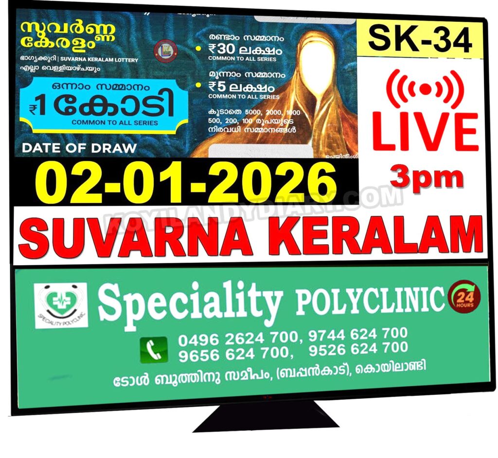 ഒന്നാം സമ്മാനം ഒരു കോടി; സുവർണ കേരളം SK 34 ലോട്ടറി നറുക്കെടുപ്പ് ഇന്ന്