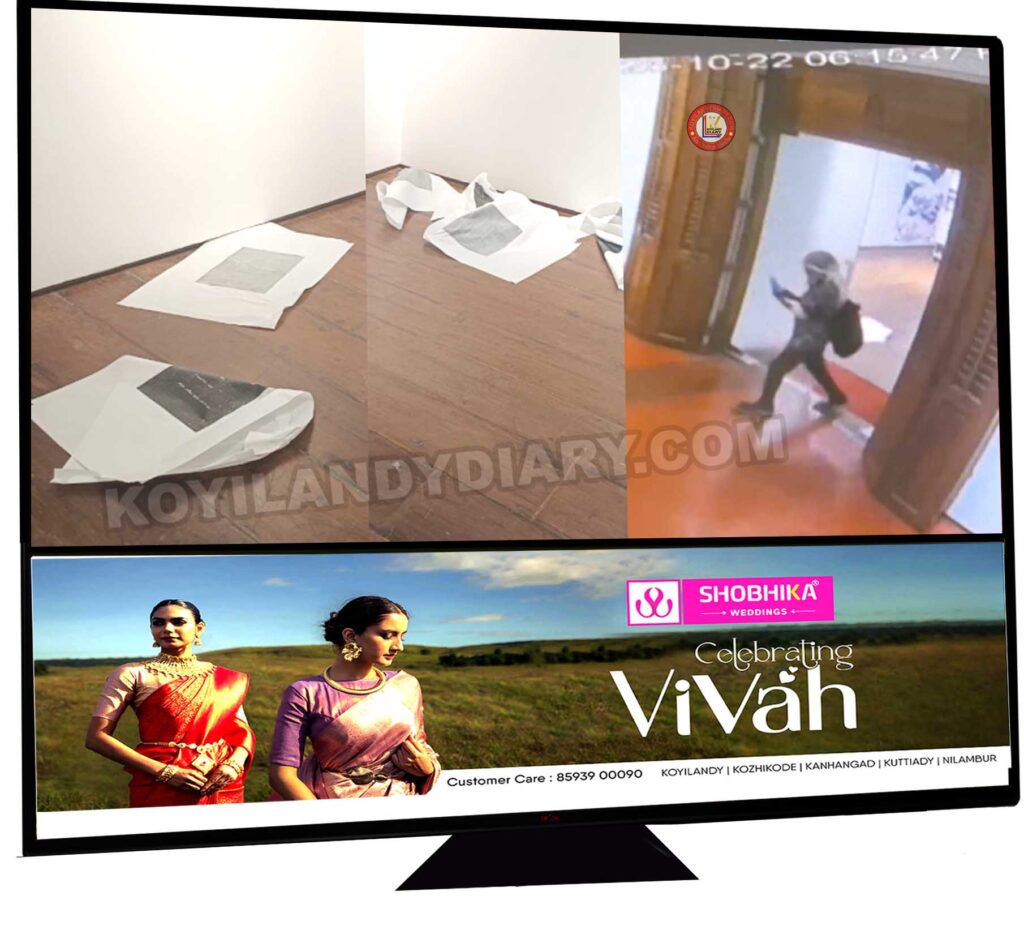 അശ്ലീലം എന്ന് ആരോപിച്ച് ലളിത കലാ അക്കാദമിയുടെ ദർബാർ ഹാളിൽ പ്രദർശിപ്പിച്ചിരുന്ന വിദേശ കലാകാരിയുടെ കലാസൃഷ്ടികൾ നശിപ്പിച്ചു. ഹനാൻ ബെനാമർ എന്ന നോർവീജിയൻ കലാകാരിയുടെ ‘ഗോ ഈറ്റ് യുവർ ഡാഡ്’ എന്ന കലാസൃഷ്ടിയാണ് ഒരാൾ കീറി നശിപ്പിച്ചത്. ചിത്രങ്ങൾ നശിപ്പിക്കുന്നതിന്റെ സിസിടിവി ദൃശ്യങ്ങൾ പുറത്ത് വന്നിട്ടുണ്ട്.