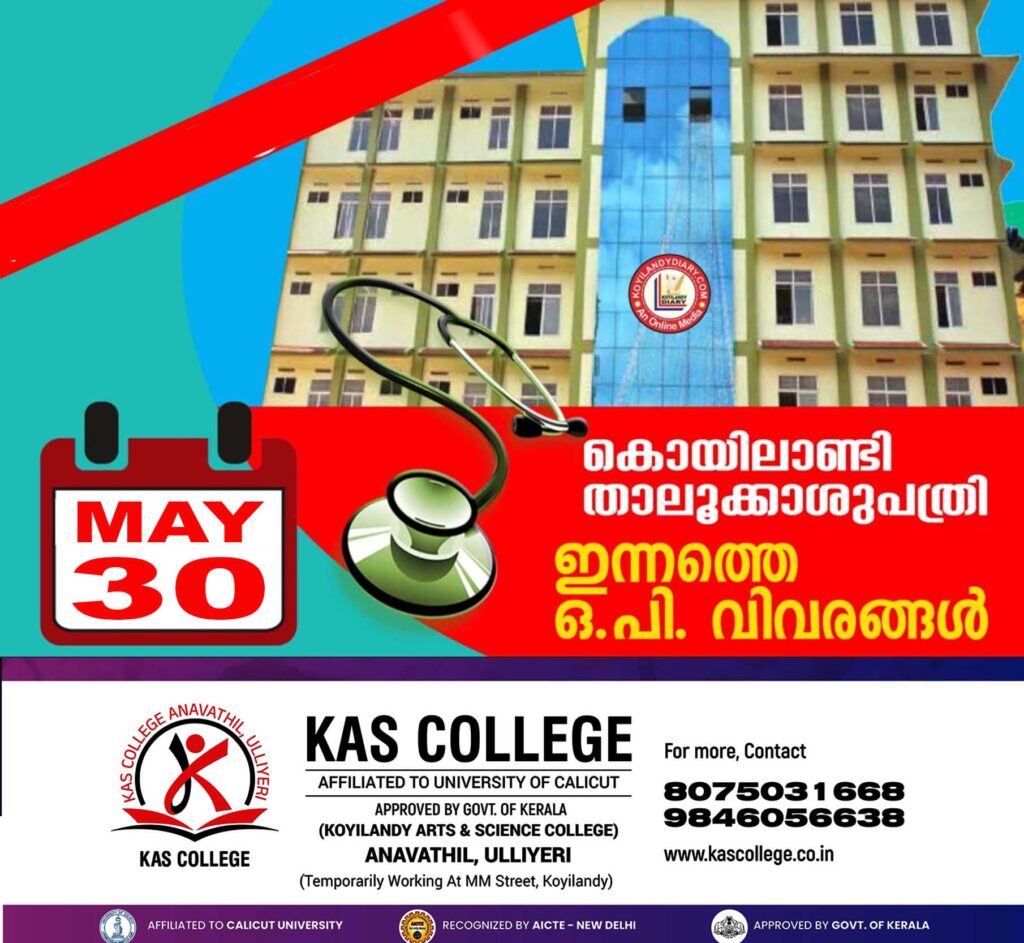 കൊയിലാണ്ടി താലൂക്കാശുപത്രിയിൽ മെയ് 30 വെള്ളിയാഴ്ചത്തെ ഒ.പിയില് ലഭിക്കുന്ന സേവനങ്ങളെക്കുറിച്ചുള്ള വിവരങ്ങള്..