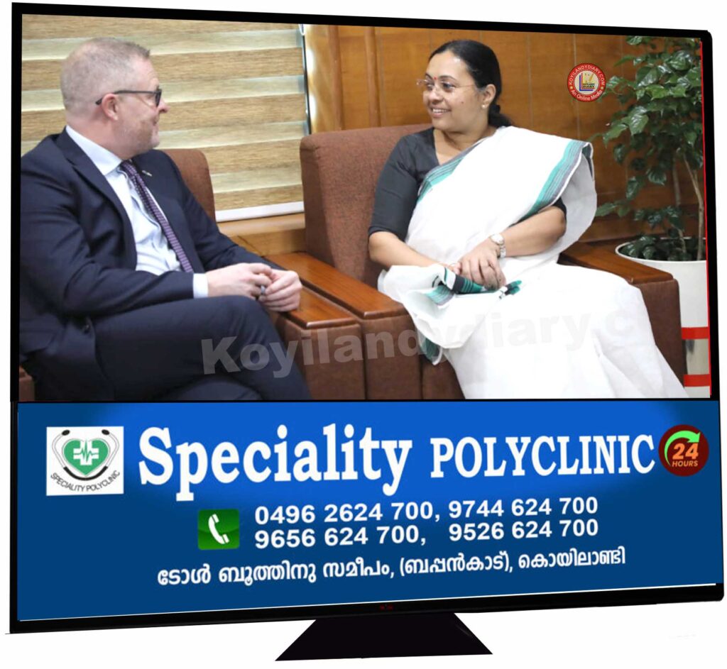ആരോഗ്യ വകുപ്പ് മന്ത്രി വീണാ ജോര്ജുമായി വെയില്സ് ആരോഗ്യ വകുപ്പ് മന്ത്രി (ഹെല്ത്ത് ആന്റ് സോഷ്യല് കെയര് കാബിനറ്റ് സെക്രട്ടറി) ജെറമി മൈല്സ് സെക്രട്ടറിയേറ്റില് ചര്ച്ച നടത്തി. കൂടുതല് ആരോഗ്യ പ്രവര്ത്തകരെ വെയില്സിലേക്ക് റിക്രൂട്ട് ചെയ്യുമെന്ന് ജെറമി മൈല്സ് പറഞ്ഞു. ദന്തല് ഡോക്ടര്മാര്ക്കും, സൈക്യാട്രി നഴ്സുമാര്ക്കും വെയില്സില് ഏറെ സാധ്യതയുണ്ട്. ആരോഗ്യ രംഗത്ത് കേരളവുമായുള്ള ബന്ധം ശക്തിപ്പെടുത്തും.