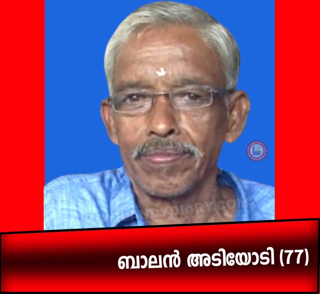 ചിങ്ങപുരം: എളമ്പിലാട് നടുവിലയിൽ കെ.സി. ബാലൻ അടിയോടി (77) നിര്യാതനായി. ഭാര്യ: പത്മിനി അമ്മ, മക്കൾ: ധന്യ. എൻ (സ്മാർട്ട് മീഡിയ ചിങ്ങപുരം), ധനേഷ് എൻ (ദുബായ്). മരുമകൻ: സുധീഷ് കുമാർ (ഗോകുലം ചിട്ടി കണ്ണൂർ). സഹോദരങ്ങൾ: നാരായണൻ അടിയോടി, ദാമോദരൻ അടിയോടി, വത്സല, വനജ.