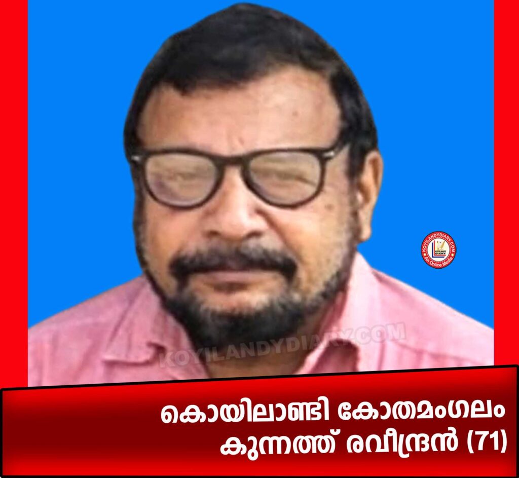 Koyilandy News Obituary കൊയിലാണ്ടി കോതമംഗലം കുന്നത്ത് രവീന്ദ്രൻ (71) (എടോടി വടകര) 1 year ago koyilandydiary കൊയിലാണ്ടി കോതമംഗലം കുന്നത്ത് രവീന്ദ്രൻ (71) (എടോടി – വടകര) നിര്യാതനായി. സഞ്ചയനം: വെള്ളിയാഴ്ച രാവിലെ. ഭാര്യ: സുമതി കുന്നത്ത്. സഹോദരങ്ങൾ: രോഹിണി, തങ്കം, പരേതരായ ദാസൻ, വിശ്വൻ, Share news Post navigation Previous കൊയിലാണ്ടി സ്പെഷ്യാലിറ്റി പോളിക്ലിനിക്കിലെ ബുധനാഴ്ചത്തെ ഒ.പി വിവരങ്ങൾNext കൊയിലാണ്ടി താലൂക്ക് ആശുപത്രിയിലെ ബുധനാഴ്ചത്തെ ഒ.പി വിവരങ്ങൾ