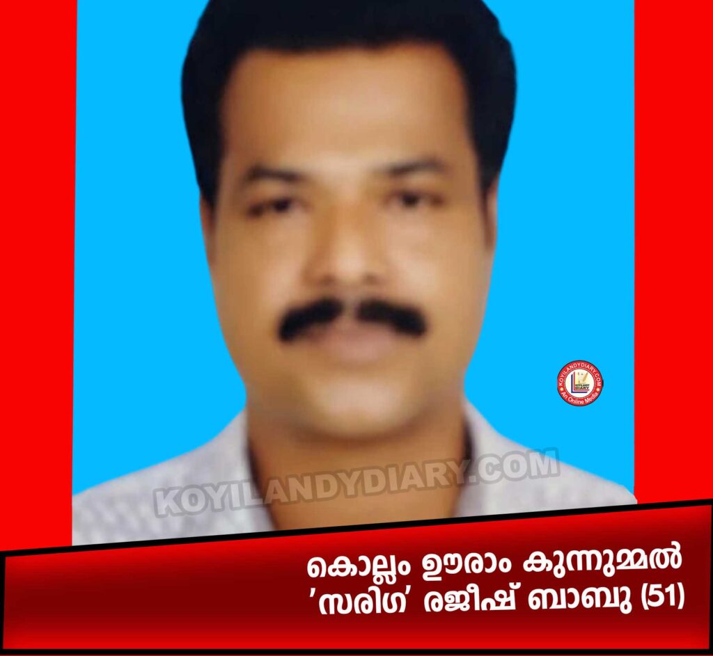 Koyilandy News Obituary കൊല്ലം ഊരാം കുന്നുമ്മൽ ‘സരിഗ’ രജീഷ് ബാബു (51) 1 year ago koyilandydiary കൊയിലാണ്ടി: കൊല്ലം ഊരാം കുന്നുമ്മൽ ‘സരിഗ’ രജീഷ് ബാബു (51) നിര്യാതനായി. കുഞ്ഞിരാമൻെയും പരേതയായ കാർത്ത്യായനിയുടെയും മകനാണ്. ഭാര്യ: ബബിന. മകൻ: ഇഷാൻ. സഹോദരി: സവിത, പരേതനായ ഗിരീശൻ. ശവസംസ്കാരം: വെള്ളിയാഴ്ച കാലത്ത് 8 മണിക്ക് വീട്ടുവളപ്പിൽ. Share news Post navigation Previous ഫ്രീ ബോഡി ചെക്കപ്പും ആരോഗ്യ ബോധവൽക്കരണ ക്യാമ്പും നടത്തിNext പൊയിൽക്കാവ് താഴെ പൊല്ലാത്ത് ശ്രീധരൻ നായർ (85)