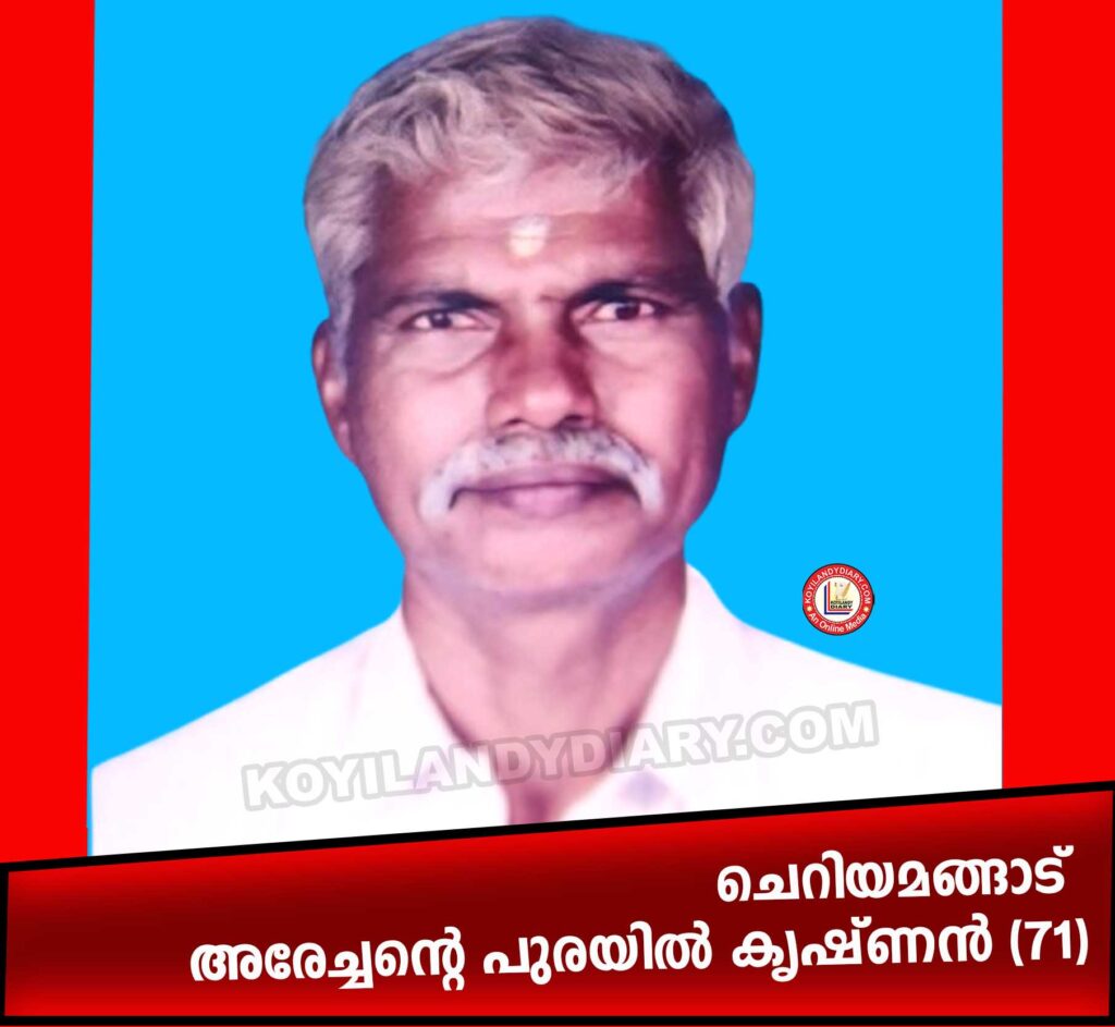 കൊയിലാണ്ടി: ചെറിയമങ്ങാട് അരേച്ചൻ്റെ പുരയിൽ കൃഷ്ണൻ (71) നിര്യാതനായി. അച്ഛൻ: പരേതനായ കുഞ്ഞിരാമൻ. അമ്മ പരേതയായ ശകുന്തള. ഭാര്യ: അനിത. മക്കൾ: രോഷിത, കിഷോർ, ശ്രുതി. മരുമകൻ: ബിജു ടി.സി. (കൊല്ലം). സഹോദരങ്ങൾ: സാവിത്രി, പത്മിനി, രാധ, മനോജ്, രമേഷ് ബാബു, അനിൽകുമാർ, ഷൈമ