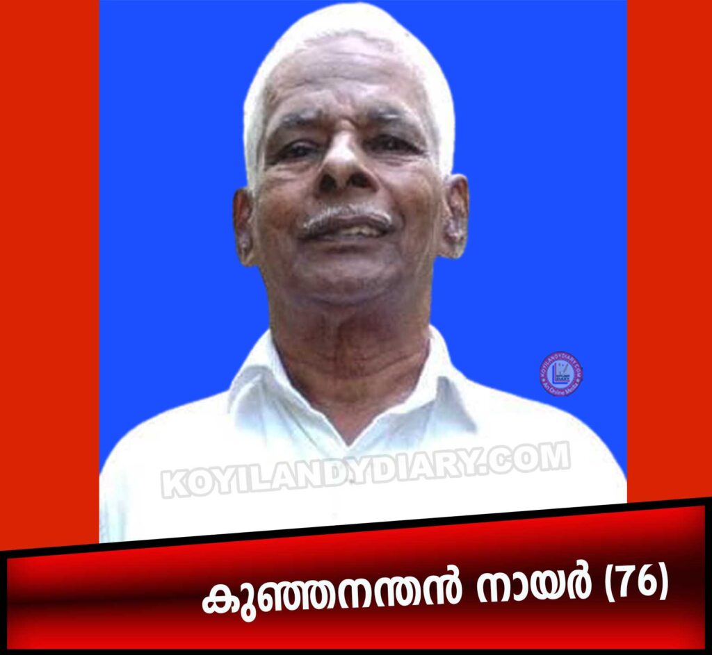 കൊയിലാണ്ടി: പന്തലായനി തെക്കയിൽ താഴെ താമസിക്കും വെള്ളിലാട്ട് കുഞ്ഞനന്തൻ നായര് (76) നിര്യാതനായി. സംസ്കാരം: ബുധനാഴ്ച ഉച്ചക്ക് 12 മണിക്ക് വീട്ടുവളപ്പിൽ. ഭാര്യ: ജാനകി. മക്കൾ: രേണുക, രേഖ, രജീഷ്. മരുമക്കള്: രാധാകൃഷ്ണന്, ഹരിദാസന്, രമ്യ. സഹോദരങ്ങൾ: ചന്തുക്കുട്ടി, ഗംഗാധരൻ, ശാന്ത.