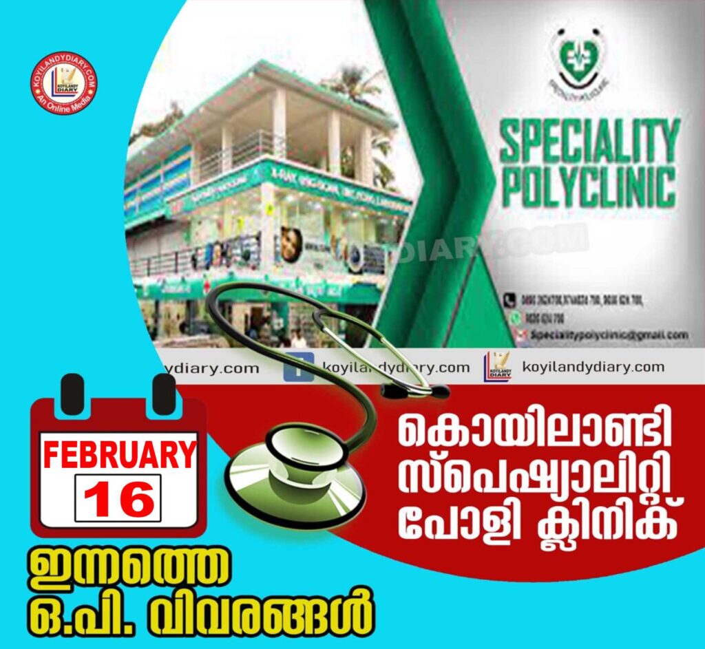 കൊയിലാണ്ടി സ്പെഷ്യാലിറ്റി പോളിക്ലിനിക്കിൽ ഫെബ്രുവരി 16 തിങ്കളാഴ്ച പ്രവർത്തിക്കുന്ന ഒപികളും ഡോക്ടർമാരും സേവനങ്ങളും.
