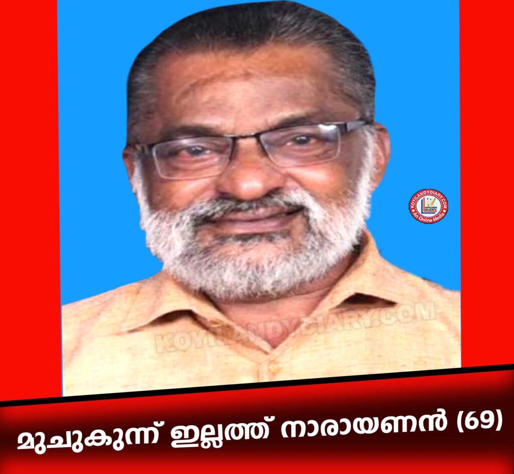 മുചുകുന്ന് ഇല്ലത്ത് നാരായണൻ (69) നിര്യാതനായി. പിതാവ്: പരേതനായ ഇല്ലത്ത് ചന്ദ്രൻ. അമ്മ: നാരായണി. ഭാര്യ: പ്രമീള. മക്കൾ: നിധിഷ (സതേൺ റെയിൽവെ, കോഴിക്കോട്) പരേതനായ നിധീഷ്, മരുമകൻ: ഷൈജു പുത്തലത്ത് (ഏഷ്യാനെറ്റ്, കോഴിക്കോട്) സഹോദരങ്ങൾ: ചിരുത, പരേതനായ കേളപ്പൻ. സഞ്ചയനം: വെള്ളിയാഴ്ച.