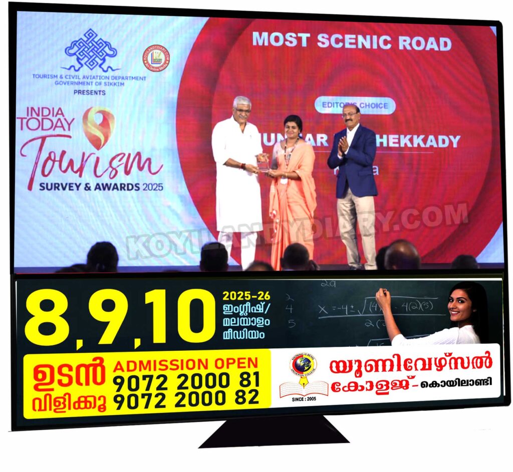 ഇന്ത്യാ ടുഡേ മാഗസിന്റെ ഇന്ത്യാ ടുഡേ ടൂറിസം സര്വേ 2025 അവാര്ഡ് കേരള ടൂറിസത്തിന്. ഏറ്റവും മനോഹരമായ റോഡ് (മോസ്റ്റ് സീനിക് റോഡ്) വിഭാഗത്തില് ഇന്ത്യ ടുഡേ എഡിറ്റേഴ്സ് ചോയ്സ് അവാര്ഡിനാണ് കേരളത്തെ തെരഞ്ഞെടുത്തത്. മൂന്നാര് മുതല് തേക്കടി വരെയുള്ള റോഡാണ് കേരളത്തെ പുരസ്കാരത്തിന് അര്ഹമാക്കിയത്.