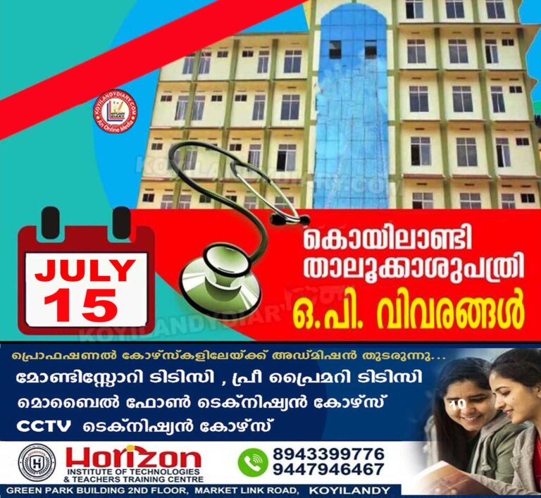 കൊയിലാണ്ടി താലൂക്കാശുപത്രിയിൽ ജൂലായ് 15 തിങ്കളാഴ്ചത്തെ ഒ.പി.യിൽ ലഭിക്കുന്ന സേവനങ്ങളെക്കുറിച്ചുള്ള വിവരങ്ങൾ. സി.ടി. സ്കാൻ പ്രവർത്തനസജ്ജം. താലൂക്കാശുപത്രിയിൽ ഇ-ഹെൽത്ത് പദ്ധതിയുടെ ഭാഗമായി ഇനി മുതൽ OP ടിക്കറ്റ് എടുക്കാൻ...