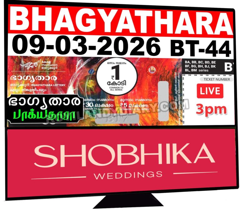 . ഭാഗ്യതാര BT 44 ലോട്ടറി നറുക്കെടുപ്പ് ഇന്ന്. ഒരു കോടി രൂപയാണ് ഒന്നാം സമ്മാനം. ഭാഗ്യതാര ഭാഗ്യക്കുറിയുടെ രണ്ടാം സമ്മാനമായി 30 ലക്ഷം രൂപയും മൂന്നാം...